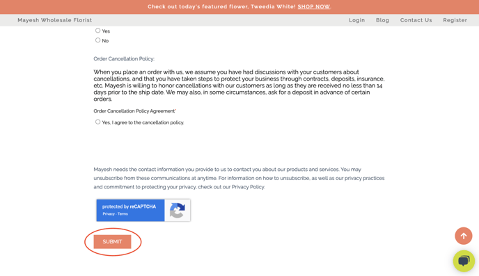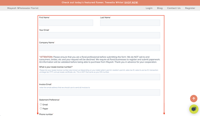 To set up an online account, you’ll need to register on the Mayesh Wholesale Florist website. Registration is quick and allows you to access online ordering tools, programs, and account features.